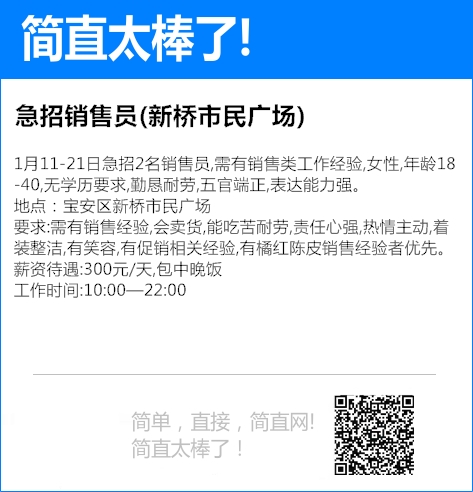 1月11-21日急招2名销售员,需有销售类工作经验,女性,年龄18-40,无学历要求,勤恳耐劳,五官端正,表达能力强。