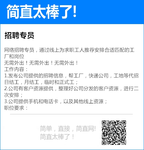 网络招聘专员,通过线上为求职工人推荐安排合适匹配的工厂和岗位