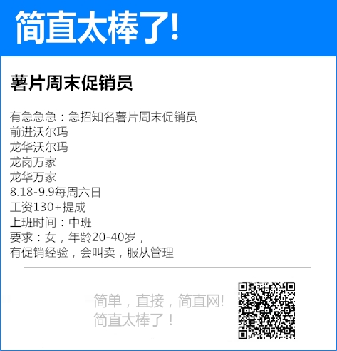有急急急:急招知名薯片周末促销员